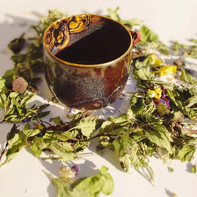 Menthe bergamote, sarriette des montagnes, sauge officinale, basilic sacré, achillée millefeuille sauvage, bleuet, calendula, bouillon blanc, coquelicot et camomille matricaire.